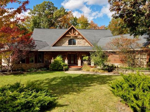 You really will appreciate this Timber Frame home and this natural setting on 2 acres adjacent to a wooded ravine and stream. Surrounded by Covered Mahogany decks, and sports a 28' stone fireplace in an incredible great room under beamed vaulted wood ceilings with old world beams setting the scene for the maple hardwood and slate floors which serve as perfect accents. This open, airey and inviting floor plan has a gourmet Cherry and Stainless kitchen with practical antiqued granite counters, a 1st floor study, entry level master with spa-like multi head shower, and a 2nd floor loft. Future bonus room or Walk-in attic, plus a sprawling finished walk-out lower level framed in for an additional bath, and including a 4th BR / 2nd study, and a home theatre / rec room!